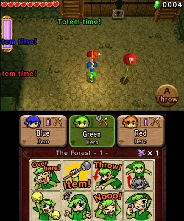 Questi ultimi sono generalmente costituiti da una grossa sezione a piattaforme, la cui costruzione, piuttosto che concentrarsi sui soli scontri, offre al giocatore una fitta serie di enigmi ambientali, culminanti poi con uno scontro con un boss. TriForce Heroes è un gioco cooperativo, progettato per un divertimento in compagnia, la qual cosa è evidente dalla particolarissima costruzione del gameplay che prevede una dinamica di coordinazione “verticale” che consiste nell’impilarsi assieme ai propri compagni per creare un “totem”. Il totem non solo permette di raggiungere piattaforme più alte, ma è addirittura integrato negli scontri con i boss che sovente spostano il loro punto debole più in alto o più in basso obbligando il team a impilarsi o magari ad organizzarsi affinché a sferrare il colpo in un dato momento sia un determinato personaggio (la qual cosa si intuisce dal colore del punto debole rispetto al colore del Link). Tuttavia anche a terra il team deve darsi sempre da fare per una corretta coordinazione, questo perché l’arma/gadget in possesso di ognuno dei giocatori (che va scelta all’inizio del livello, ovviamente non in una selezione randomica ma preimpostata) è sempre funzionale alla risoluzione degli enigmi, enigmi che spesso (quasi sempre) prevedono l’interazione di almeno due dei giocatori. Ovviamente non mancano obiettivi da dover conseguire autonomamente, come situazioni in cui attraverso l’uso della propria arma si deve interagire direttamente con uno degli altri giocatori, magari creando occasioni di movimento o combattimento (generi una bomba, la passi ad un compagno ad esempio).