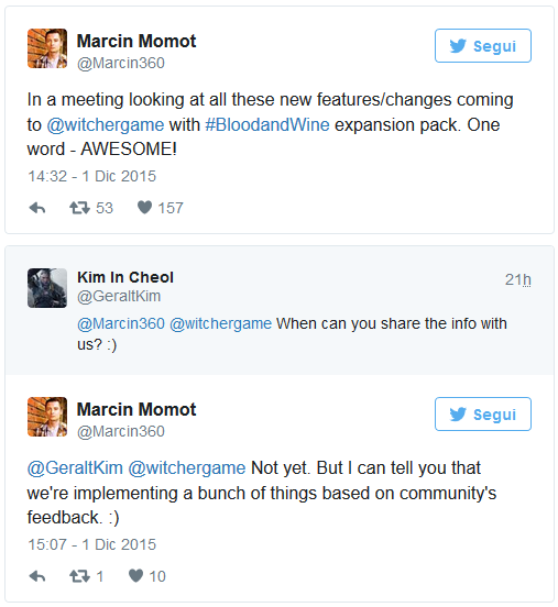 Marcin Momot, responsabile della community di CD Projekt RED ha commentato l’uscita dell’espansione di The Witcher 3, Wine and Blood, con alcuni entusiastici tweet.