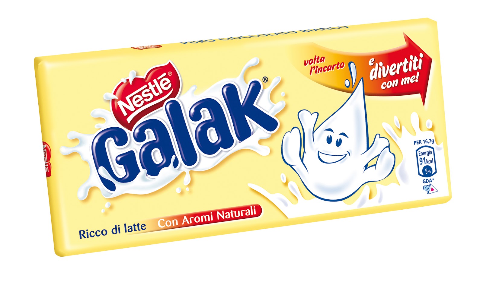 Il Galak o si amava o si odiava. A me personalmente non piaceva molto, sarà stato per quel maledetto delfino psicopatico sulla confezione che rideva sempre, sarà che tutto quel bianco mi faceva strano e che alla fine sembrava burro zuccherato, ma la Nestlé ha continuato a produrlo senza sosta dal 1967, quindi qualche estimatore lo deve avere. Negli ultimi anni il delfino è sparito e la mascotte è diventata un gocciolone bianco dal senso decisamente equivocabile.