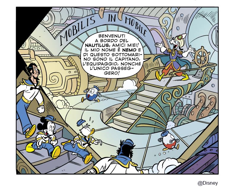 Nella New York del 1870 comincia la famosa traversata degli oceani per svelare il segreto della minaccia marina che turba i viaggi di tantissime navi. A guidare la spedizione sulla fregata Alabama, lo scienziato Michel de Topolin. Nel corso della navigazione, però, l’Alabama entrerà in contatto con il sottomarino Nautilus, realizzato in gran segreto dal Capitano Nemo (interpretato da Pippo). Cosa succederà? Misteri in profondità e atmosfere intrise di avventura sono alla base dunque di questa nuova grande avventura Disney che riprende lo storico lavoro di Verne pubblicato nel 1870 e che accompagnerà tutti i lettori del magazine a fumetti più amato per due settimane.