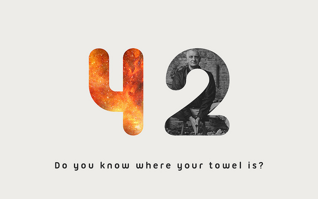 Quando Adams è morto, a soli 49 anni, l’11 maggio 2001, i suoi fan si sono mobilitati per celebrarne la memoria, accordandosi per istituire il Towel Day, il giorno dell’asciugamano. Dopo un lungo dibattimento sulla data, che prevedeva proposte come il quarantaduesimo giorno dell’anno, o il quarantaduesimo giorno dopo la sua morte, è stato deciso di festeggiare due settimane dopo la sua scomparsa, il 25 maggio, che quell’anno, casualmente, era anche il venerdì prima del quarantaduesimo fine-settimana dell’anno, un’altra delle proposte avanzate. Ancora più casualmente, se convertite la somma di 25+5 da esadecimale a decimale, il numero risultante sarà 42.