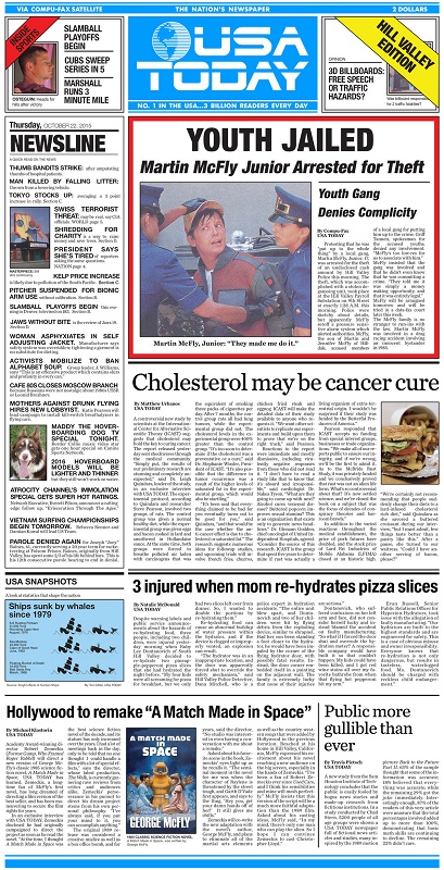 Come se non bastasse, in allegato al giornale verrà regalata una copia completa della versione dell’USA Today del 21 ottobre 2015 di Ritorno al Futuro, con tanto di articoli di fantasia elaborati secondo quanto mostrato dal film.