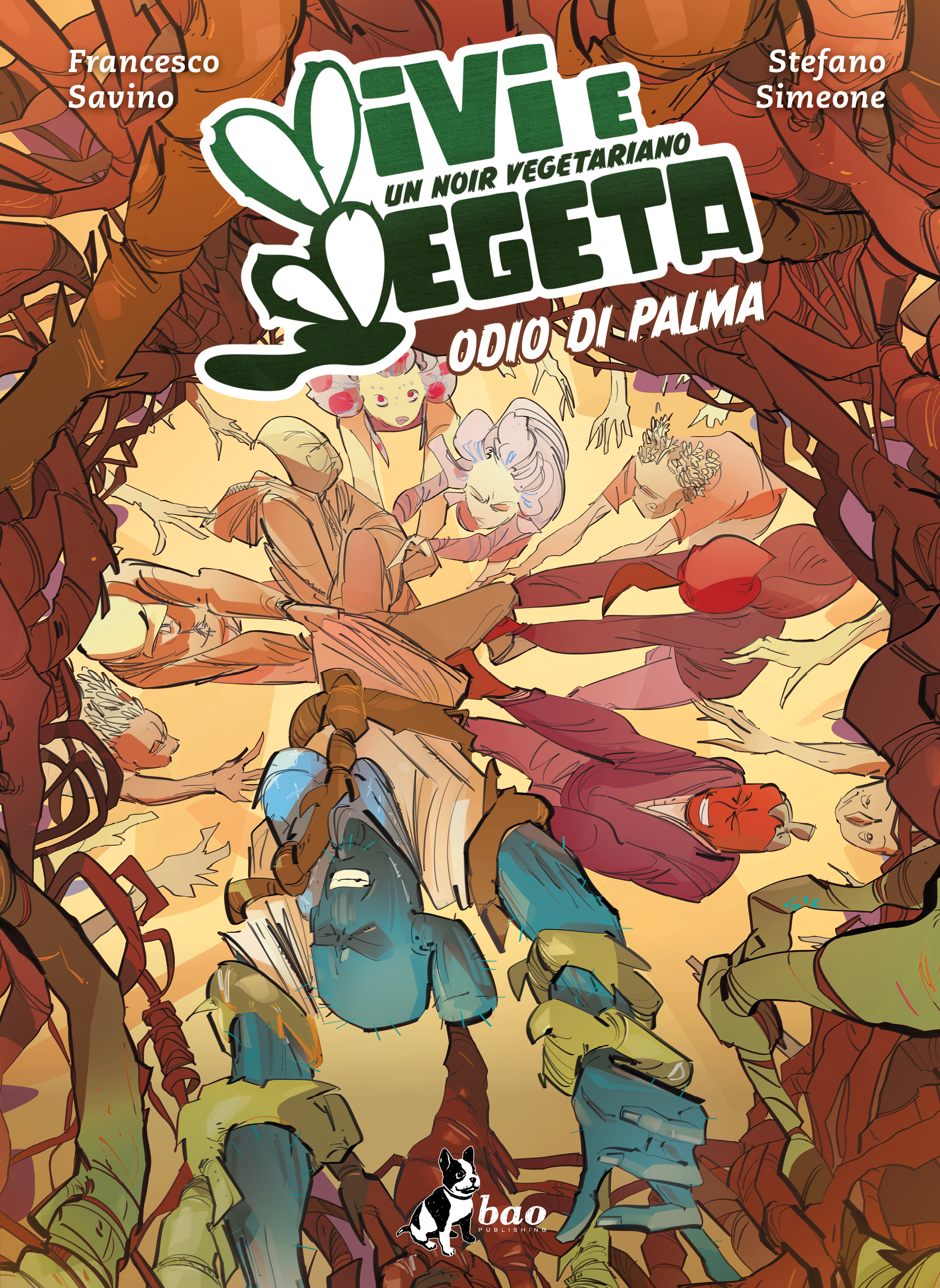 A volte ce lo scordiamo, ma Internet ha anche dei lati positivi. Sì, so che questa affermazione rischia di farvi saltare in piedi sulla sedia e di farvi provare un odio viscerale verso l’autore del presente articolo. Non ci siamo più abituati, ma quella galassia pressoché infinita d’informazioni volatili che chiamiamo “rete” ha condizionato le nostre vite portando alcuni insostituibili vantaggi. Basti pensare alle app in stile Foodora e Justeat, che vi hanno permesso di avere dietro modico compenso gustose leccornie ad ogni ora del giorno e della notte sulla pelle di poveri rider poco pagati. Oppure a Google che, per quanto non tutti ne siano consapevoli, è capace di rispondere a qualunque domanda mai partorita dalla mente umana (sì, anche come si fa a programmare la stampante). In realtà, l’aspetto forse più rivoluzionario è quello che cela dietro di se la più terribile delle ambiguità: il diritto di parola esteso a miliardi di persone, la possibilità di essere visti e di stare costantemente sotto i riflettori. Se questa novità ha dato l’opportunità a legioni di imbecilli (per citare il compianto Umberto Eco) di uscire fuori dalle loro caverne e sparare cavolate a più non posso, ha tuttavia anche permesso a meritevoli talenti di avere quell’occasione della vita che, altrimenti, non sarebbe stata concessa. Dunque, ringraziate l’Internet se abbiamo avuto la saga “verde” di Vivi e Vegeta: un noir vegetariano scritta da Francesco Savino e disegnata da Stefano Simeone, nato come webcomic e portato nel mondo reale da Bao Publishing, che ora ha deciso di stampare l’attesissima seconda stagione intitolata Odio di palma.