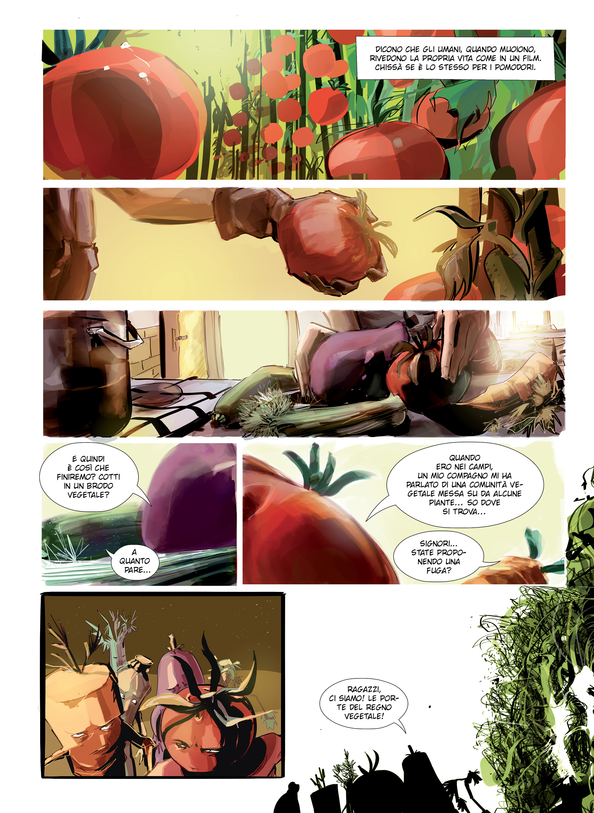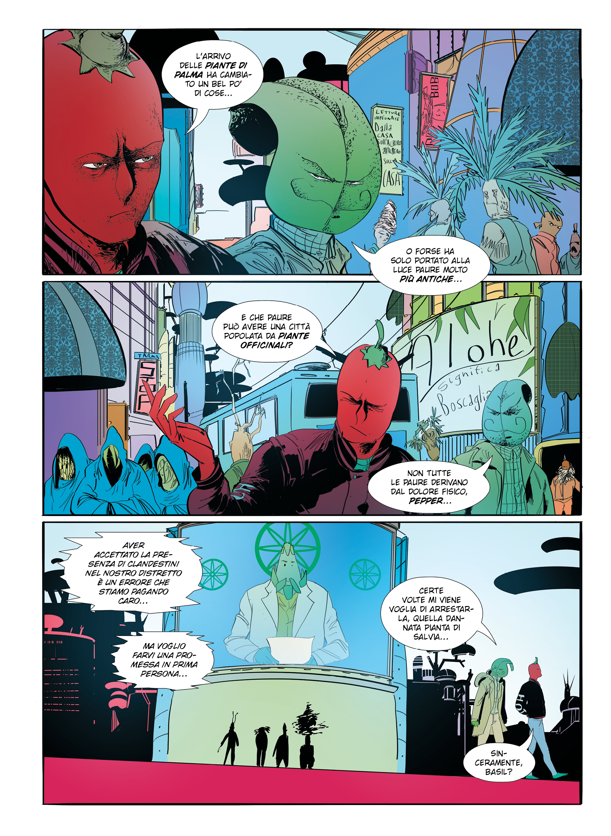 Ma il cocktail vegano offerto dalla casa non esaurisce certo qui il suo sapore. Savino orchestra una trama appassionante, che trasuda di riferimenti pop da ogni lato, mettendo in scena un noir che non è un noir, pieno di citazioni e suggestioni, dal paranormale alla fantascienza, creando un mosaico culturale variegato che spesso stupisce per la genialità di alcune frasi, dei dialoghi, o anche solo dei titoli che introducono i vari capitoli. Un panorama accentuato da Simeone che (non prendetela male) sembra trovarsi perfettamente a suo agio tra le bizzarre piante antropomorfe che abitano il regno vegetale. C’è da chiedersi se lui stesso non veda il mondo in questo modo, visto che ha caratterizzato ogni personaggio in maniera eccellente esaltandone le peculiarità umane (e verdi), ampliando così nella seconda stagione un cast che si fa sempre più variegato e multiforme. Interessantissimo è anche l’episodio inedito “Papyrus“, un’indagine del detective Basil illustrato da La Tram (pseudonimo di Margherita Tramutoli) che funge in parte anche da prequel all’intero volume. Assolutamente valido è anche il breve racconto “Svuotato“, che vede come autore completo Stefano Simeone esprimersi con un tratto diverso da quello abituale.