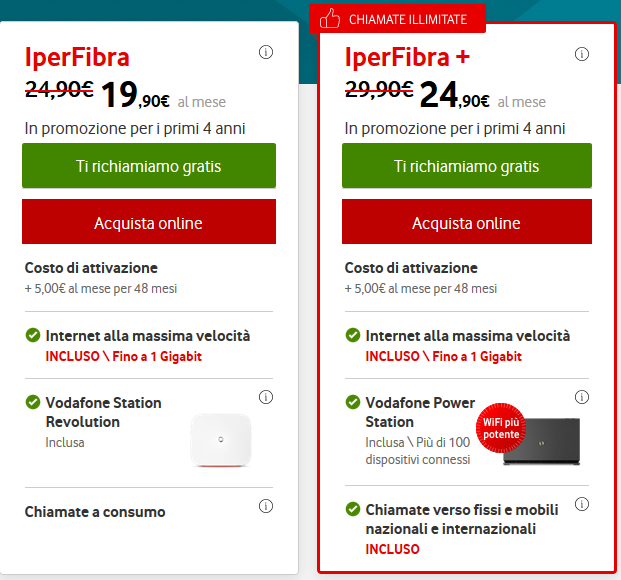 La promozione include uno sconto di 5 euro sulle offerte IperFibra e IperFibra+, che contengono sostanzialmente le stesse cose (connessione ultraveloce fino a 1 gigabit, e la Vodafone Station), ma l’offerta plus comprende anche le chiamate verso fissi e mobili.