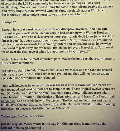 “Non abbiamo intenzione di adattare i dodici volumi creati da Mr. Moore e Mr. Gibbon trent’anni fa. Quei volumi sono territorio sacro e non saranno ritrattati o ricreati o riprodotti o protagonisti di un reboot.