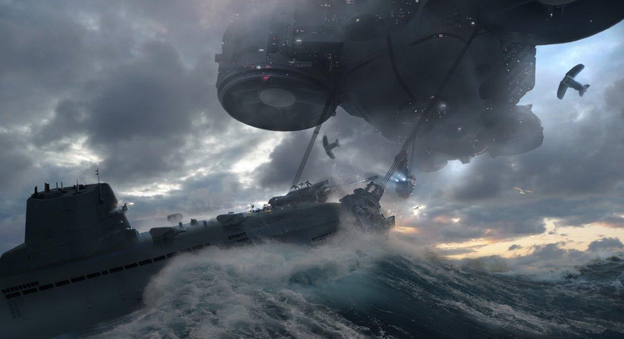 Questa è la prima immagine che abbiamo sviluppato mostrando la fortezza aerea Ausmerzer mentre attacca il sottomarino gigante della resistenza.