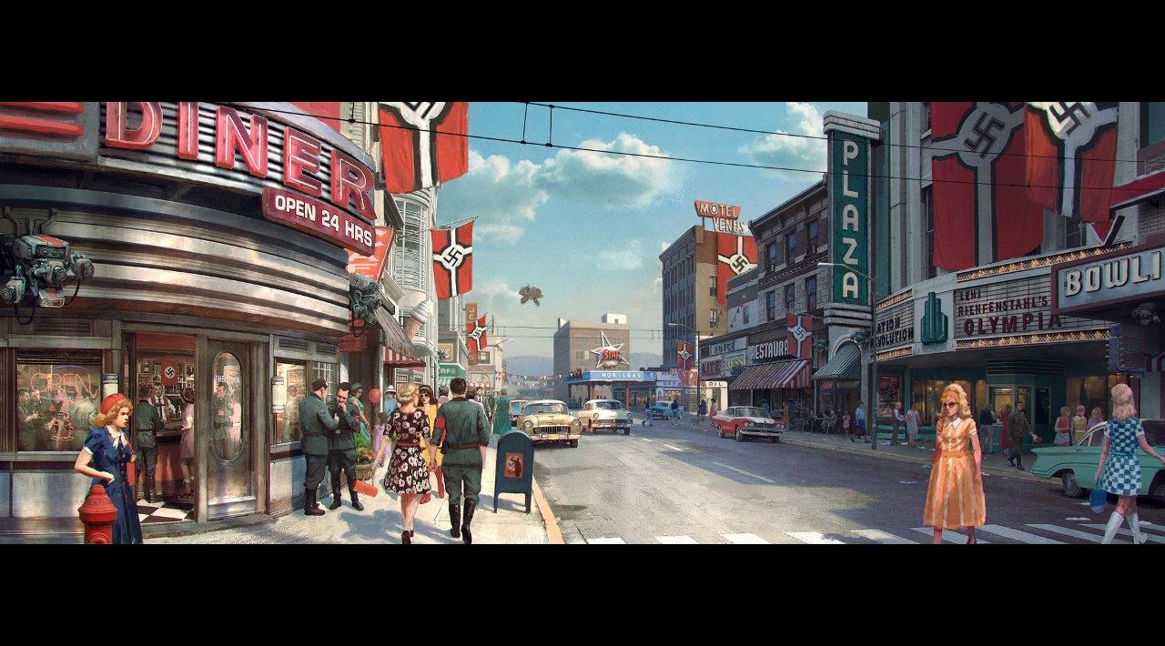 In questo gioco abbiamo un mix surreale. Il classico sogno americano con cielo azzurro e Diners, le classiche macchine americane e ragazze sorridenti che camminano per la strada. Ma c’è qualcosa di strano in questi ambienti. I caccia nazisti stanno ruggendo nel cielo, in lontananza si intravede una parata nazista e le ragazze sorridenti di prima stanno camminando insieme ad ufficiali tedeschi. Nel gioco, quest’America particolare, popolata da nazisti, ci farà vivere momenti davvero surreali.
