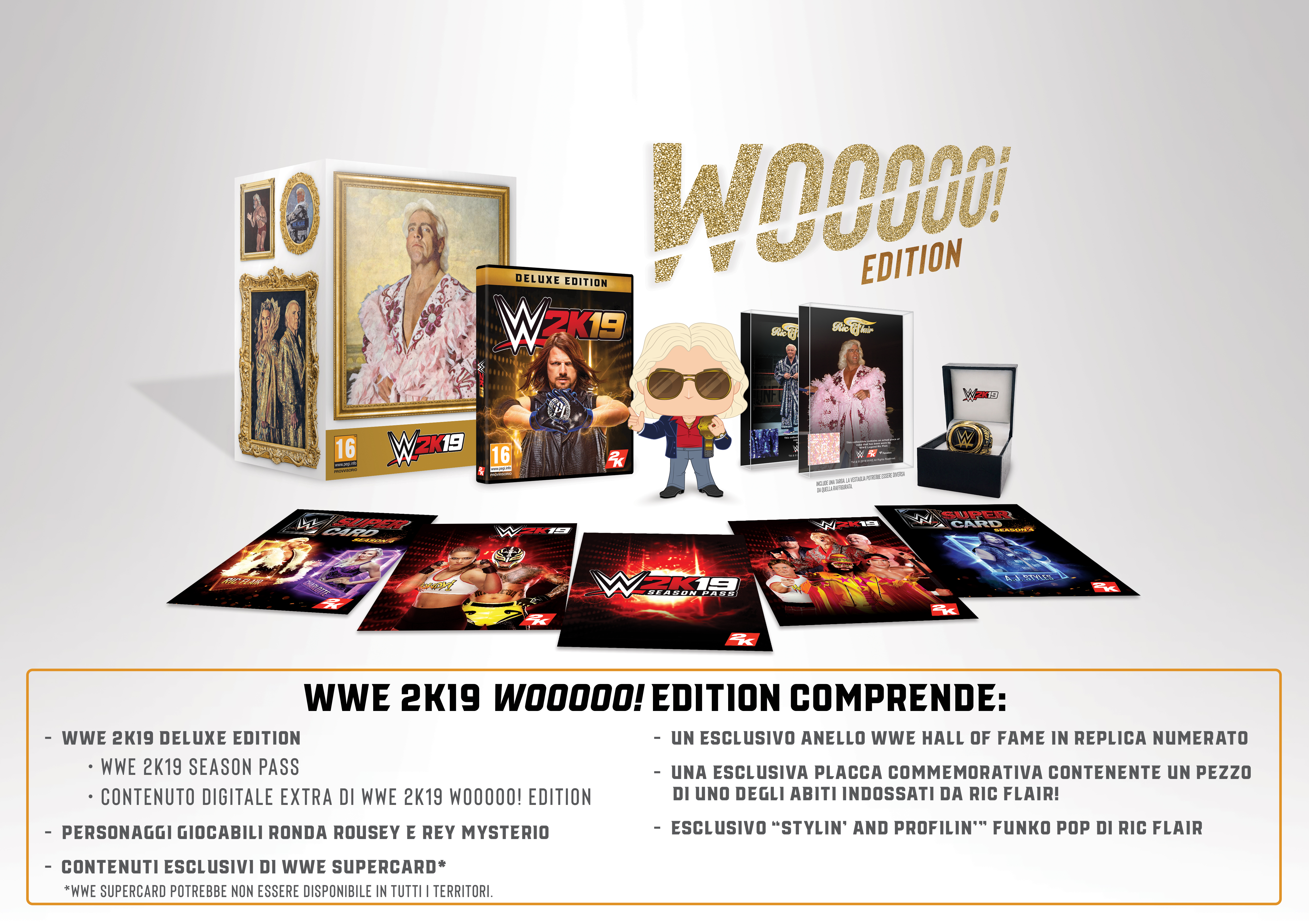 In onore del 16 volte WWE World Champion, icona pop e WWE Hall of Famer Ric Flair – un uomo la cui attitudine rappresenta al meglio il motto “Never Say Never”– la WWE 2K19 Wooooo! Edition sarà prodotta in tutto il mondo in edizione limitata di 30.000 copie.