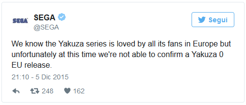 Per quanto riguarda Yakuza 0 invece non si hanno conferme. L’avventura che farà da prequel narrando gli eventi precedenti al primo Yakuza, dapprima sembrava stata annunciata anche localizzata in Occidente, ma poi è arrivata la doccia fredda con la smentita da parte di SEGA via Twitter.