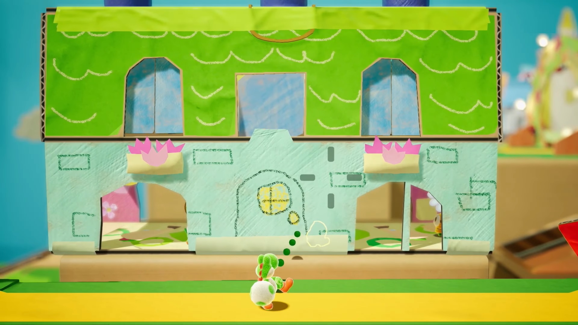 Sin dalla prima occhiata del video gameplay proposto, si può notare il chiaro richiamo a Yoshi Woolly World (ma anche un po’ Little Big Planet) perché viene riutilizzato l’espediente del mondo “in miniatura” creato attraverso materiali “realistici”, in questo titolo si tratta del cartone, che compone in maniera deliziosa tutti i paesaggi/sfondi dei livelli, i quali si sviluppano su un piano orizzontale 2d, nonostante la natura poligonale del titolo, permetta sovente anche incursioni ludiche nella terza dimensione. I dettagli più piccoli sono invece composti da ritagli di carta e spesso, i pezzi sono uniti con lo scotch. Questo accade nel “mondo sul retro”, eh sì, perché nel gameplay pare chiaro che anche in questo titolo, come per Paper Mario, si giocherà molto sulla creazione di una sorta di illusione ottica, un miscuglio della prospettiva, un doppio mondo se proprio vogliamo, esplorazione su più livelli che permettono al gioco di assumere dinamiche originali e ultimamente piuttosto rare. Questo mondo è sottosopra, letteralmente, a partire dai palazzi capovolti ai fiorellini collezionabili.
